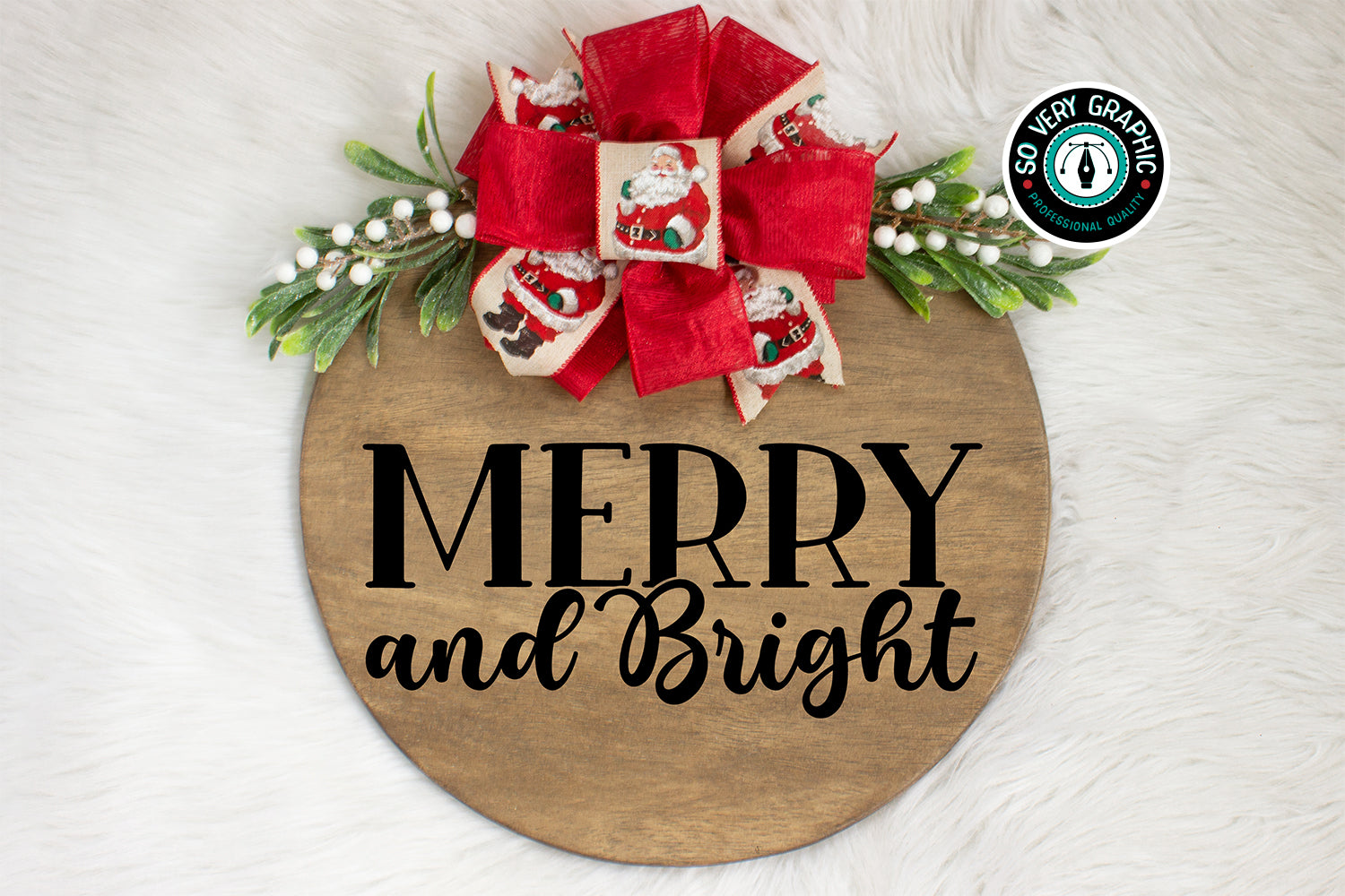 Merry & Bright Round Wood Welcome Sign SVG Cut File for Cricut, Silhouette, Brother Scan N Cut machines.